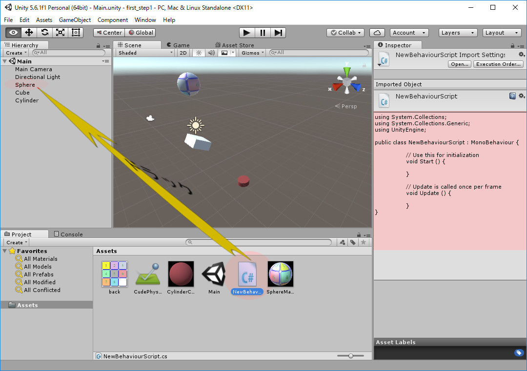 上のイメージのように[Sphere]へスクリプトをドラックします。すると次のメッセージがでるでしょう。