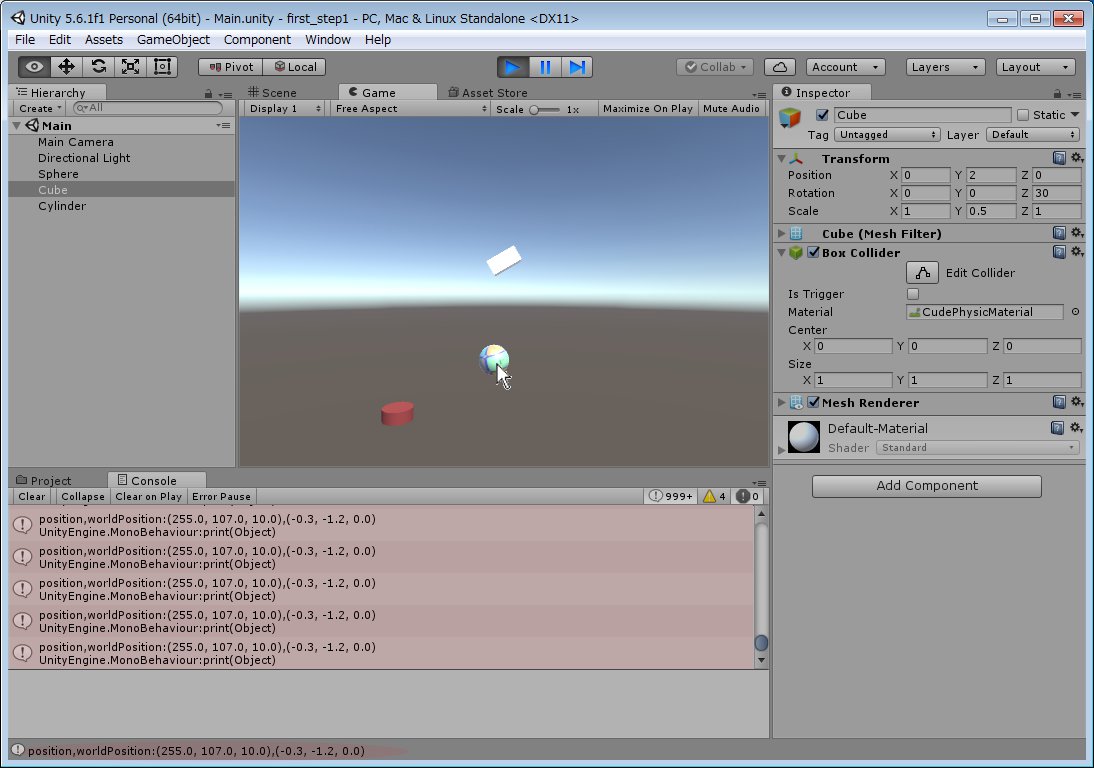 すぐ上に表示している"position,worldPosition:(255,107,0),(-0.3,-1.2,0.0)"は、print命令で得られる表示で、値の確認のために使っています。