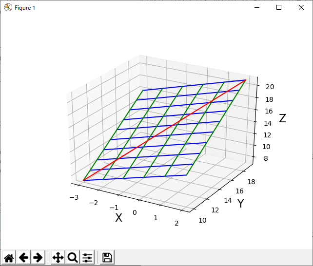 def plot_xyz_to_xyz(x1,y1,z1, x2,y2,z3 , color="red"): X = np.array( [ [x1, x2] ]) Y = np.array( [ [y1, y2] ]) Z = np.array( [ [z1, z2] ]) ax.plot_wireframe(X,Y,Z, color=color) #ワイヤーフレームのプロット x1,y1,z1, x2,y2,z2 = (-3, 10 , 7, 2, 19, 21) plot_xyz_to_xyz( x1,y1,z1, x2,y2,z2 ) # 線をプロットする。 # 矢印をプロットする。 px, py, pz = ( np.array([[-3]]), np.array([[10]]), np.array([[ 7]]) ) u, v, w = ( np.array([[ 0 ]]), np.array([[ 0 ]]), np.array([[ 1 ]]) ) ax.quiver(px, py, pz, u, v, w, length=5, normalize=True, color="green") # 矢印プロット plt.show() #表示
