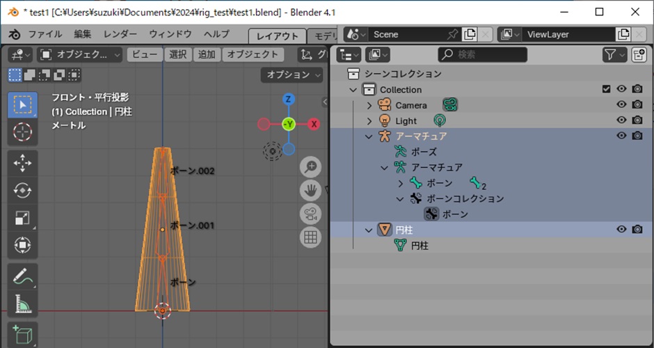 そのために、Blenderでは「アーマチュア」とメッシュオブジェクトを親子関係する必要があります。