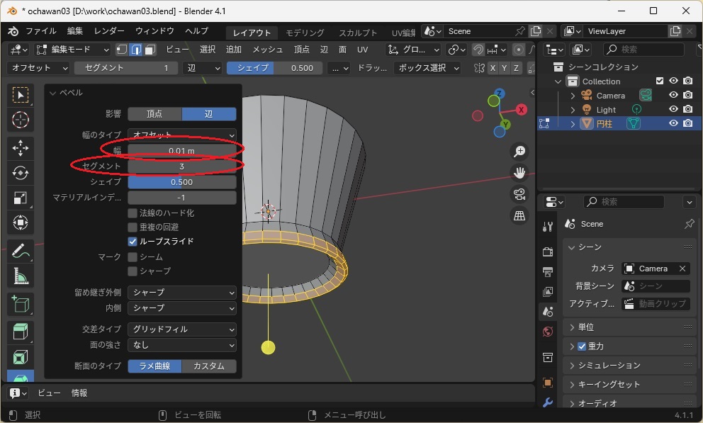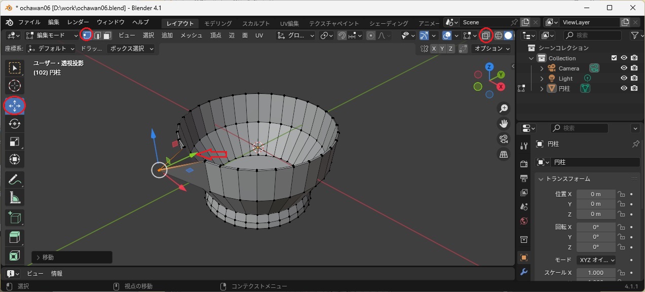 ここで、[File]メニューの[保存]選択で、「ochawan.blend」の名前で保存します