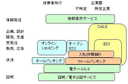 | BtoB EC | Business to Business | 企業間ビジネス | 各企業で統合サービスを行うケースが多くなってきている。(例:TWX-21) |
