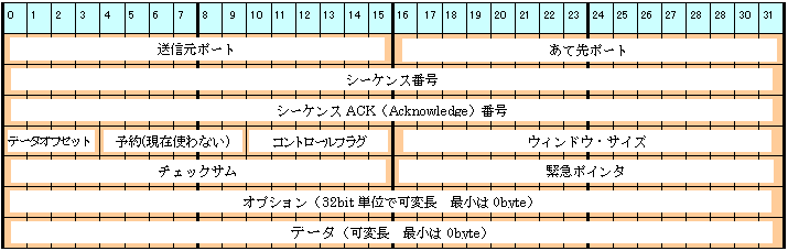 | PSH | push | 受信したデータをすみやかに上位アプリケーションに引き渡すように要求する時に1をセット(アプリケーションによる実装依存で、ほとんど1がセット) |
