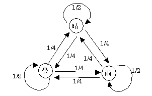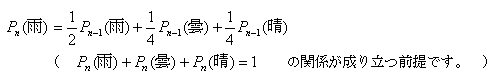 | 雨 | 1 | 1/2 | 1/2×1/2 + 1/4×1/4 + 1/4×1/4 = 6/16 | 22/64 | ・・・ | 1/3 |