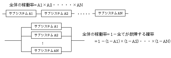 なお、稼働率は正常に運用できる確率の値と捉えるとよく、直列稼動ではどれか1台の故障が全体の故障になるので、各稼働率を掛けた値が全体の稼働率になり、並列稼動にした場合は、全てが故障する確率の補集合になる。