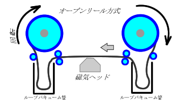 テープドライブ内に巻き取り用のリールが装備されており、このリールへテープを送り出すことによりテープを走行させ、読み書きを行う方式