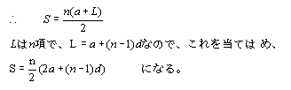 初項がa、公差がd、項数がnの等差数列の和Sを求める公式は、末項をLとすると、次のように求まる。