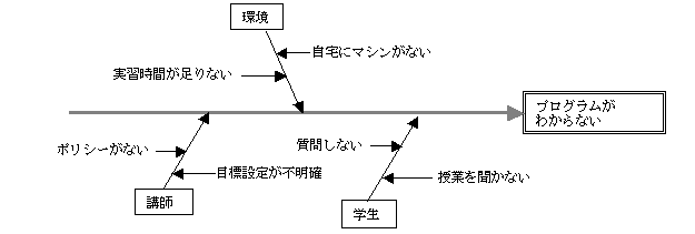 問題とする特性と,それに影響を及ぼしていると思われる要因との関連を整理して,魚の骨のような図で体系的にまとめたものです。