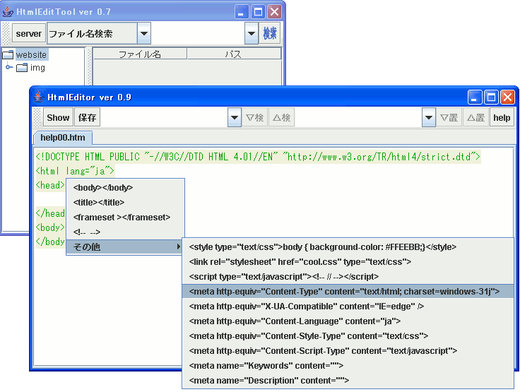 編集用ウインドの操作例です。編集機能では、入力補助機能として、 Controlを押しながら < のキーを押して ポップアップメニューから選んだタグを挿入できます。
