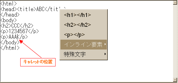 出現するポップアップメニューはキャレット位置によって変化することに注目ください。