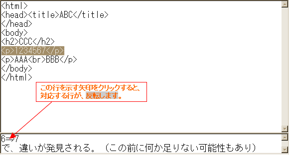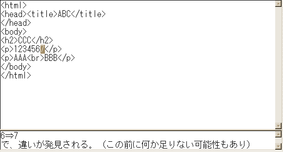 下の行番号直後⇒の箇所をクリックしています。これで間違いと判断された行が反転します。この場合は、6行目の7が現れた所で間違と判断していることが分かります。