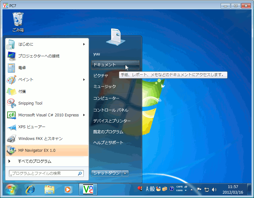 これがさきほど保存した、ドキュメントと呼ばれるファイル格納場所で、