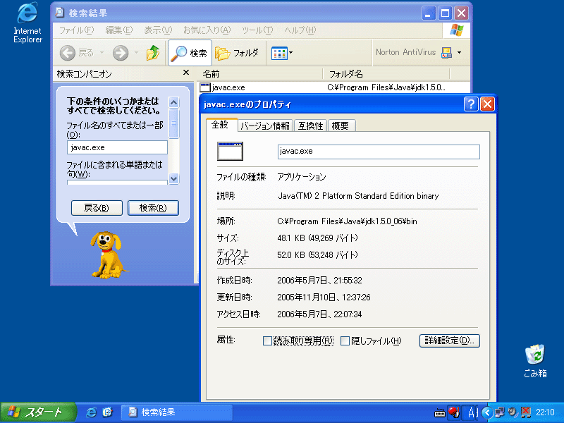 そして、『javac.exe』を探し、見つかったファイルのプロパティからその位置確認します。