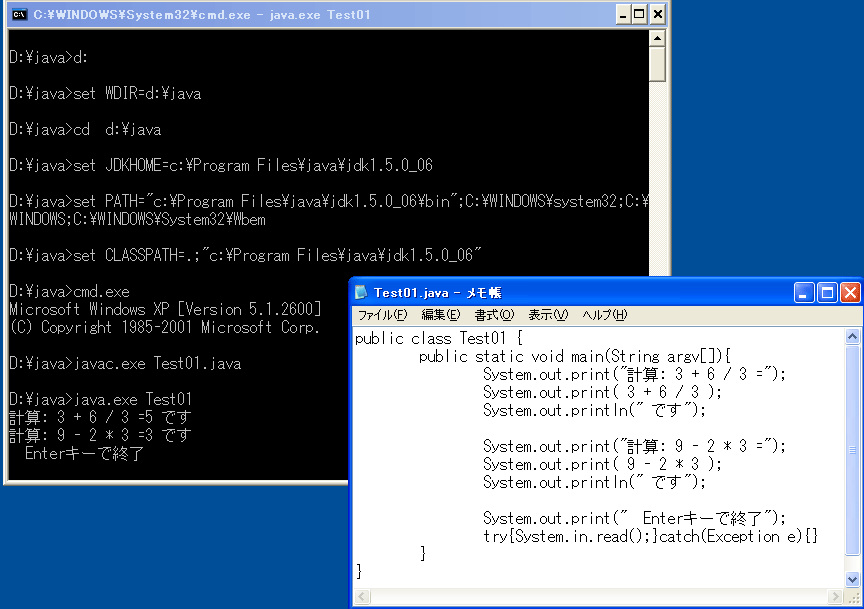 d: set WDIR=d:\java cd %WDIR% set JDKHOME=c:\Program Files\java\jdk1.5.0_06 set PATH="%JDKHOME%\bin";%PATH% set CLASSPATH=.;"%JDKHOME%" cmd.exe