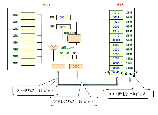 主記憶の容量は65536 語で,そのアドレスは0 〜 65535 番地です。