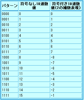 数値には、符号付きと符号なしを区別して、符号付きでは2の補数で記憶するのが一般的です。