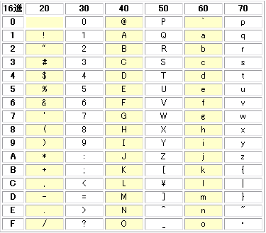 最初にASCIIで規格化され、JIS(JISX0201コード)やほとんどの規格で、同じように決められています。
