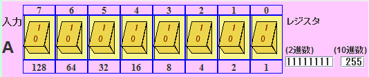 そして、3行目(128 64 32 16 8 4 2 1 の並びで初期値が0)が2進の各桁に対応する10進数の大きさです。