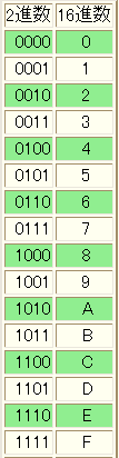 これは、2進数を下の桁から4ビットごと区切って、 左の表で16進へ変換した表現です。