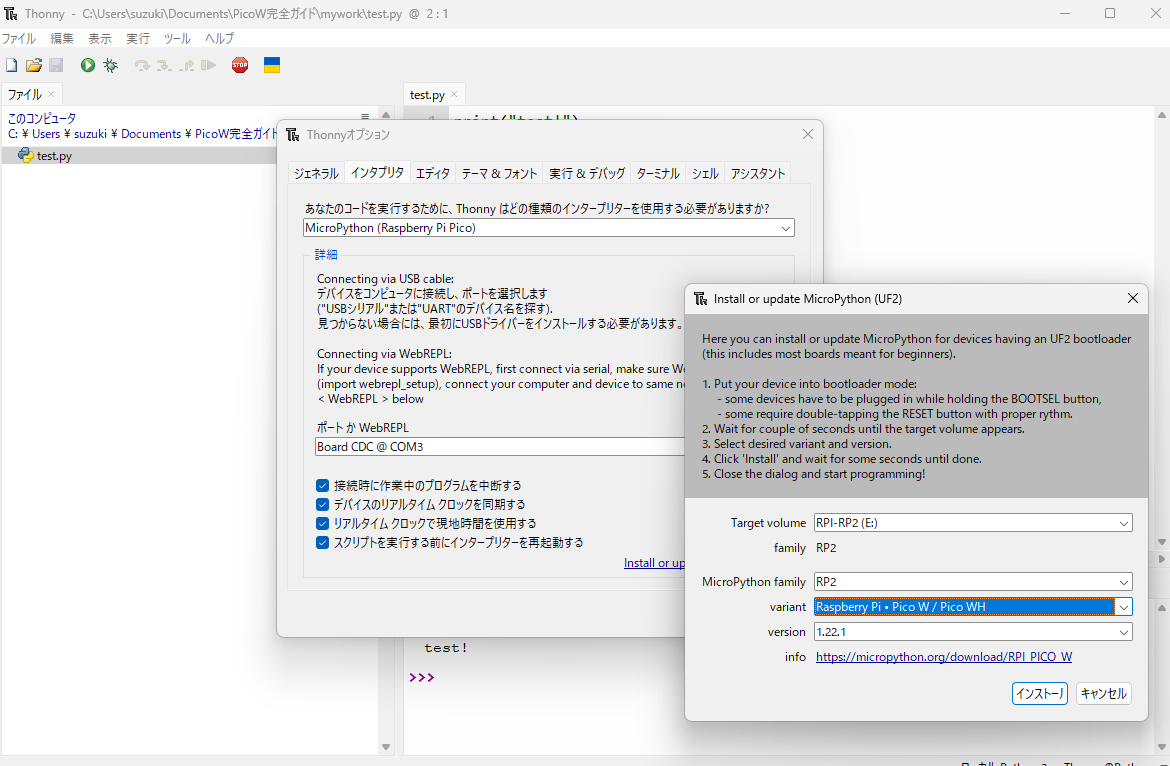 使用した統合開発環境(IDE)のThonny(トニー)では、インストールの後にこの状態(電源投入時にBOOTSELボタンを押して起動した状態)で、 MicroPythonをインストールします。
