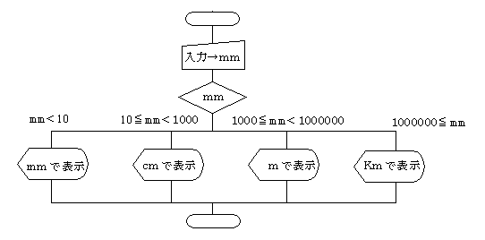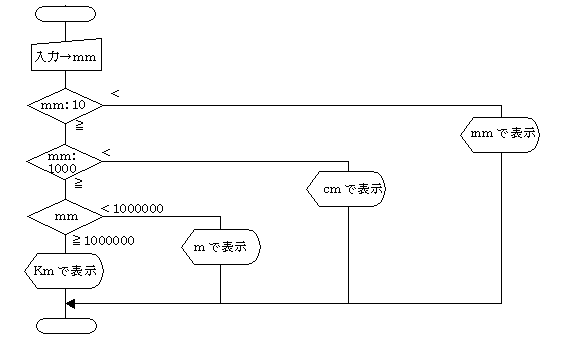 1000000mm以上ならKmの単位で表示させる次の実行例のようなプログラムです。