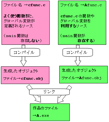 C言語では、複数のソースファイルを結合して、一つの実行可能ファイルを作成することができます。