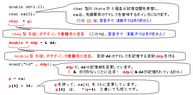なおpやddpは変数なので、p = ca;のように記憶内容を変更することができます。