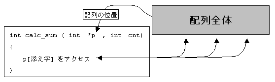 この場合の、関数側におけるポインタを介した記憶域のアクセスは、呼び出し側のローカル な配列でも可能になります。