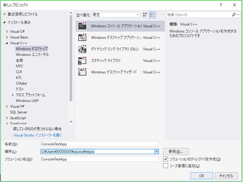 出現ダイアログの「VisualC++」で、名前を「ConsoleTestApp」にします。場所はデフォルトで「C:\Users\XXXXXXX\source\repos」のままでOKをクリックします。