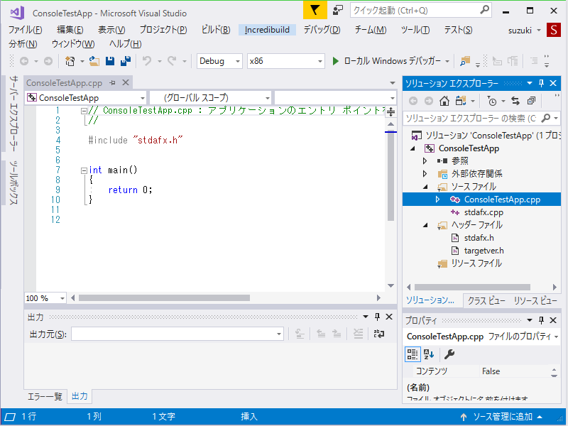 上記の操作では「C:\Users\XXXXXXX\source\repos\ConsoleTestApp\ConsoleTestApp」 の中に、「ConsoleTestApp.cpp」のmainがあるソースファイルが一つ作られます。