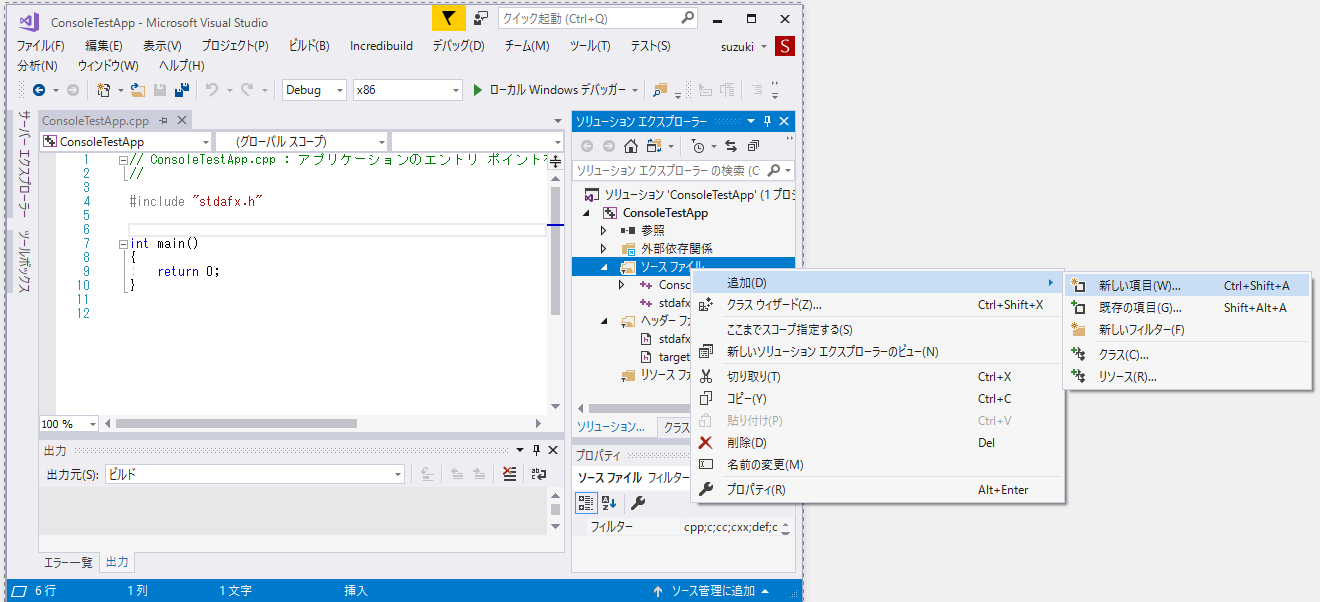 出現ダイアログで、[Visual C++]の[C++ファイル(.cpp)]を選択して、名前を付けて追加します。
