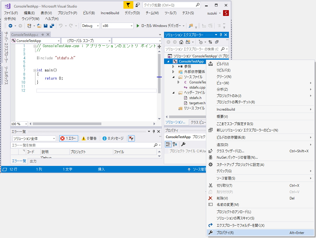 「ソリューション エクスプローラー」内のプロジェクト名の箇所(「? ConsoleTestApp」)を右クリックして、メニューから「プロパティ」を選択します。