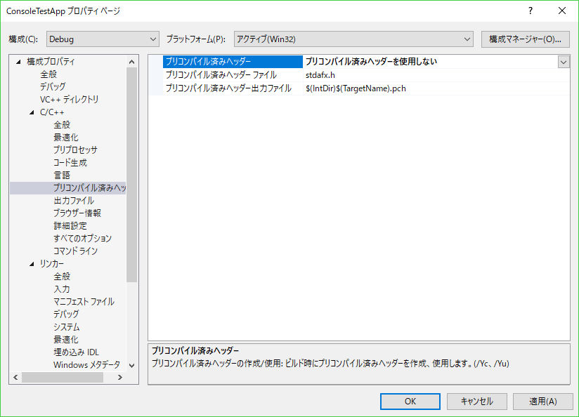 これで出現するダイアログで、 [構成プロパティ]内の[C/C++]内の[プリコンパイル済みヘッダー]の「使用 (/Yu)」を 「プリコンパイル済みヘッダーを使用しない」に変更します。