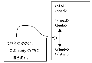 <body>と</body>で範囲を指定した部分を、この順番に一つだけ書く規則になっています。