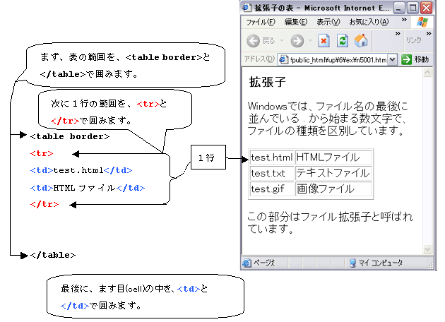 <html> <head> <title>拡張子の表 </title> </head> <body> <h3> 拡張子</h3> <p>Windowsでは、ファイル名の最後に並んでいる ドットの . から始まる文字で、ファイルの種類を区別しています。</p> <table border> <tr> <td>test.html</td> <td>HTMLファイル</td> </tr> <tr> <td>test.txt</td> <td>テキストファイル</td> </tr> <tr> <td>test.gif</td> <td>画像ファイル</td> </tr> </table> <p>この部分はファイル拡張子と呼ばれています。</p> </body> </html>