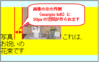 <p style="background-color: yellow;"> 写真:<img src="gazou.jpg" style="margin-left: 20px;"> これは、<br>お祝いの<br>花束です</p> 左右上下を個別に指定できます。 右はmargin-right、 上はmargin-top、 下はmargin-bottomを 使います |