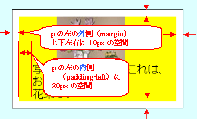 <p style="background-color: yellow; padding: 10px;"> 写真:<img src="gazou.jpg"> これは、<br>お祝いの<br>花束です</p> (pの内側に上下左右のすべてで10ピクセルの空間ができています。) 左右上下を個別に指定できます。 左はpadding-left、 右はpadding-right、 上はpadding-top、 下はpadding-bottomを 使います。 |