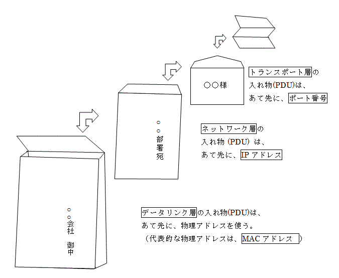そのイメージは封筒に似ています。各封筒は、運ぶ仕組みや、運ぶ人が異なります。