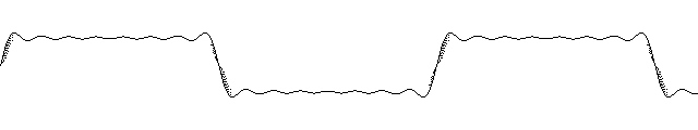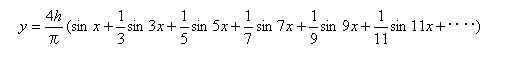 この波形は、振幅が2h 周期が2πの方形波で、次の式で8項まで合成したものです。