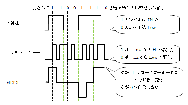 対して、100BASE-Tの信号は、MLT-3(Multi-Level Transmission-3)形式で伝達しています。