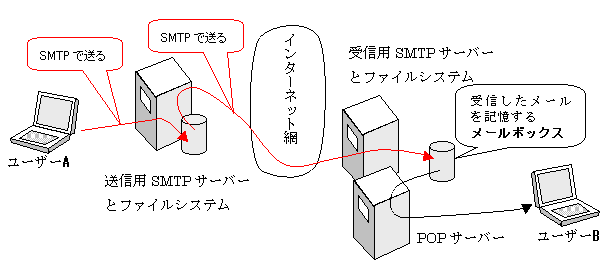 そこでは、POP3サーバーも動いており、ユーザーBは、これに接続して、POP3のプロトコルでメールをダウンロードします。