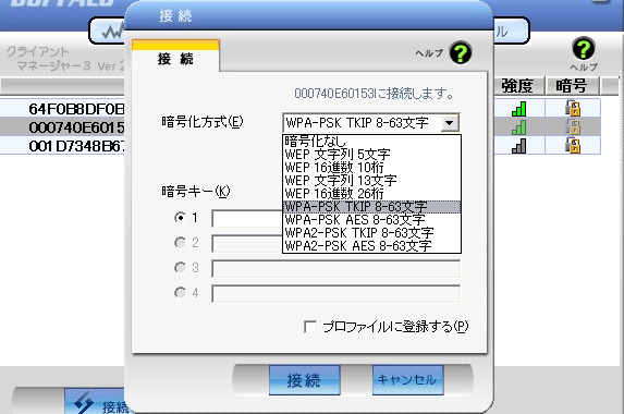 以下は、無線子機に付属する設定ツールで、親機を探して設定している画面の一部です。 親機選んで、親機の暗号に合わせて「WPA-PSK-TKIP」を設定しようしている画面です。 (BUFFALO様製品の例です。)