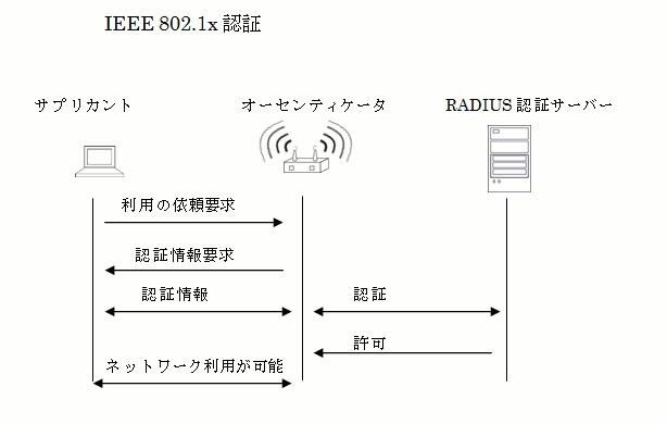 IEEE 802.1x には、下記イメージのように ユーザーID、パスワード、証明書を管理して認証する「RADIUS認証サーバ」、と「サプリカント(Supplicant)」と呼ばれる認証クライアントソフトが必要です。 また「サプリカント」と「RADIUS認証サーバ」()の間で、 EAP(Extensible Authentication Protocol:PPPを拡張した認証プロトコル)により「RADIUS認証サーバ」とやり取りした結果から 「サプリカント」のアクセスを制御を行うオーセンティケータ( Authenticate )も必要です。