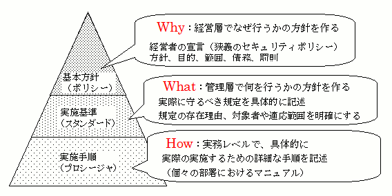 それは、情報セキュリティ基本方針、実施(又は対策)基準、実施手順の構造です。