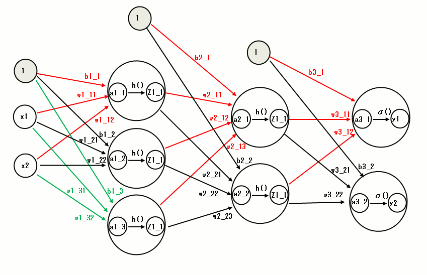 辞書は上記例と同じで'W1','W2','W3'が各層の重みで、'b1','b2','b3'がバイアスです。