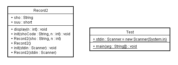 このプログラムは、Record2クラスとTestクラスの2つで実行できました。