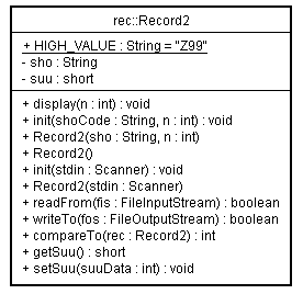 右に示すRecord2クラスを利用し、 『transact0.bin』のファイルの商品番号をキーにして集計し、 集計結果のファイル『transact1.bin』を作成します。