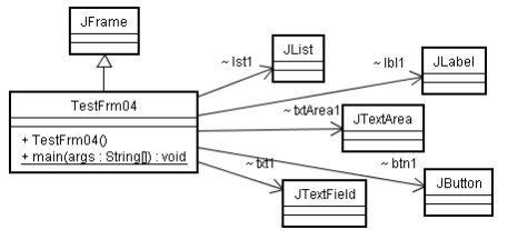 package test; import java.awt.Container;// 入れ物のクラス import java.awt.BorderLayout;// Borderの名前の配置クラス import java.awt.Color; import java.awt.Font; import javax.swing.JFrame; import javax.swing.JButton; import javax.swing.JLabel; import javax.swing.JList; import javax.swing.JTextField; import javax.swing.JTextArea; public class TestFrm04 extends JFrame { JButton btn1 = new JButton("Set"); JLabel lbl1 = new JLabel("ラベル1"); JList lst1 = new JList(new String[] { "abc", "123 45", "あいう" }); JTextField txt1 = new JTextField("変更して入力"); JTextArea txtArea1 = new JTextArea("複数の\r\n行を\r\n入力"); public TestFrm04(){ Container container = getContentPane(); this.setDefaultCloseOperation(JFrame.DISPOSE_ON_CLOSE); this.setTitle("TestFrm04"); container.add(btn1, BorderLayout.EAST); container.add(this.lbl1, BorderLayout.NORTH); this.lbl1.setOpaque(true);//ラベルを「不透明な」設定にします。 this.lbl1.setBackground(new Color(100, 255, 100));//ラベルの背景色設定 container.add(this.lst1, BorderLayout.WEST); container.add(this.txt1, BorderLayout.SOUTH); container.add(this.txtArea1, BorderLayout.CENTER); this.txtArea1.setFont(new Font("Serif", Font.BOLD, 20)); //フォント設定 this.txtArea1.setBackground(new Color(255, 255, 100));//テキストエリアの背景色設定 this.setBounds(0, 0, 200, 160); this.setVisible(true); } public static void main(String[] args){ new TestFrm04(); JFrame frm2 = new TestFrm04(); frm2.setTitle("TestFrm04-2"); frm2.setBounds(100, 200, 200, 240); } }