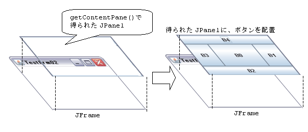 上記は、getContentPane()で得られたJPanelオブジェクトに、ボタンを配置している