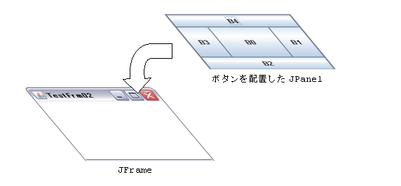 この構造は、ボタンを配置したJPanelオブジェクトを、フレームのContentPaneに